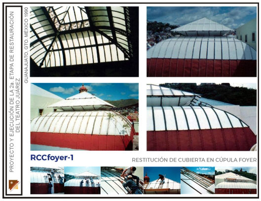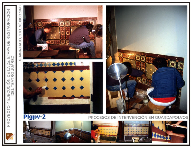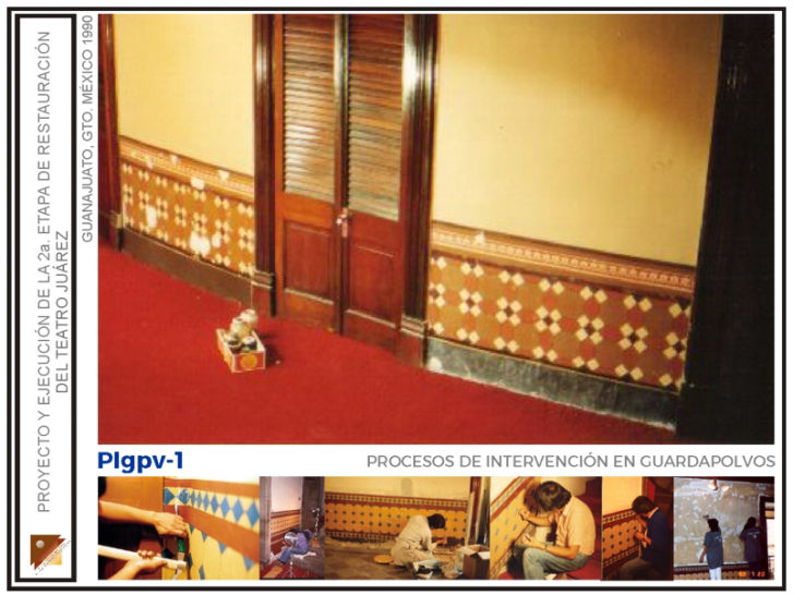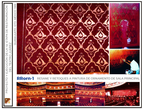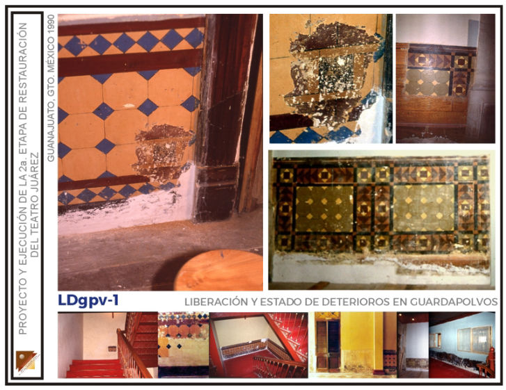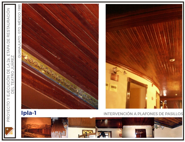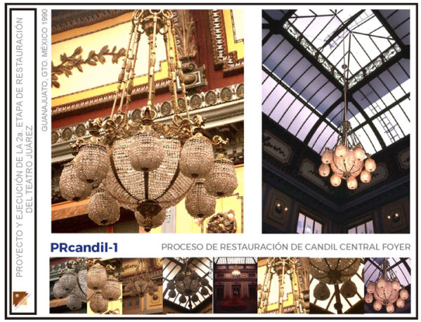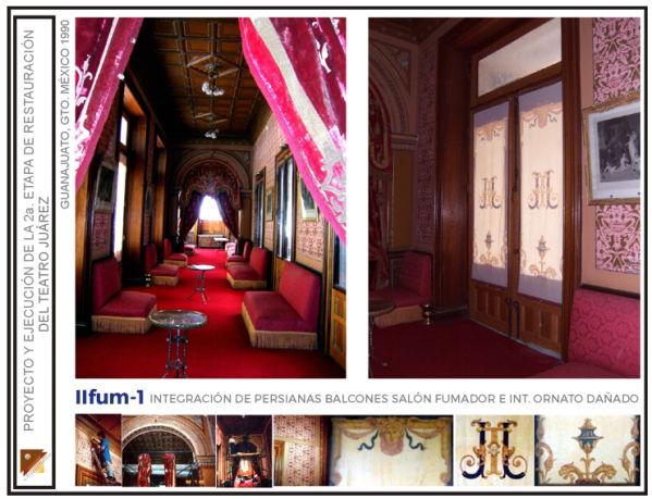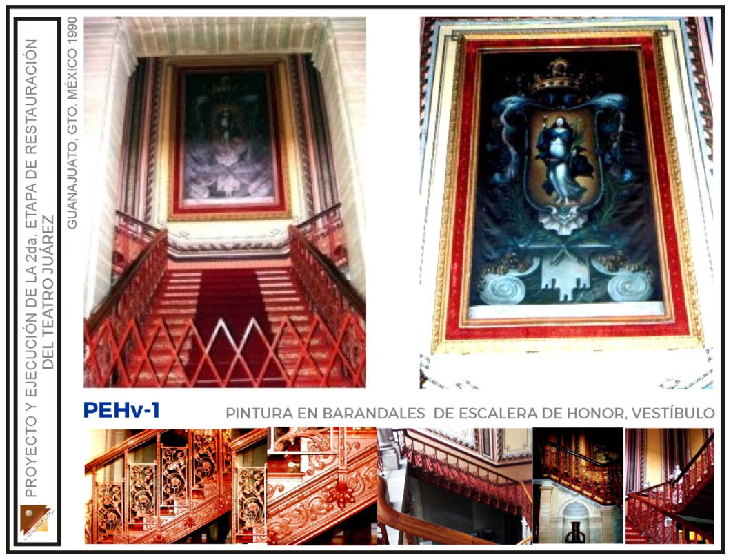 Intervención de remozamiento de escalera de honor, restitución de elementos faltantes en plafones de pasillos, ebanistería en palcos rescate de decorado en guardapolvos pasillos, restitución de ornato perdido en muros interiores de sala, intervención de restauración general en muros y plafones del salón fumador; rescate de decorado original en paneles decorativos del foyer, restauración del candil principal en foyer, en el Teatro Juárez de la ciudad de Guanajuato, Gto. (Segunda etapa)